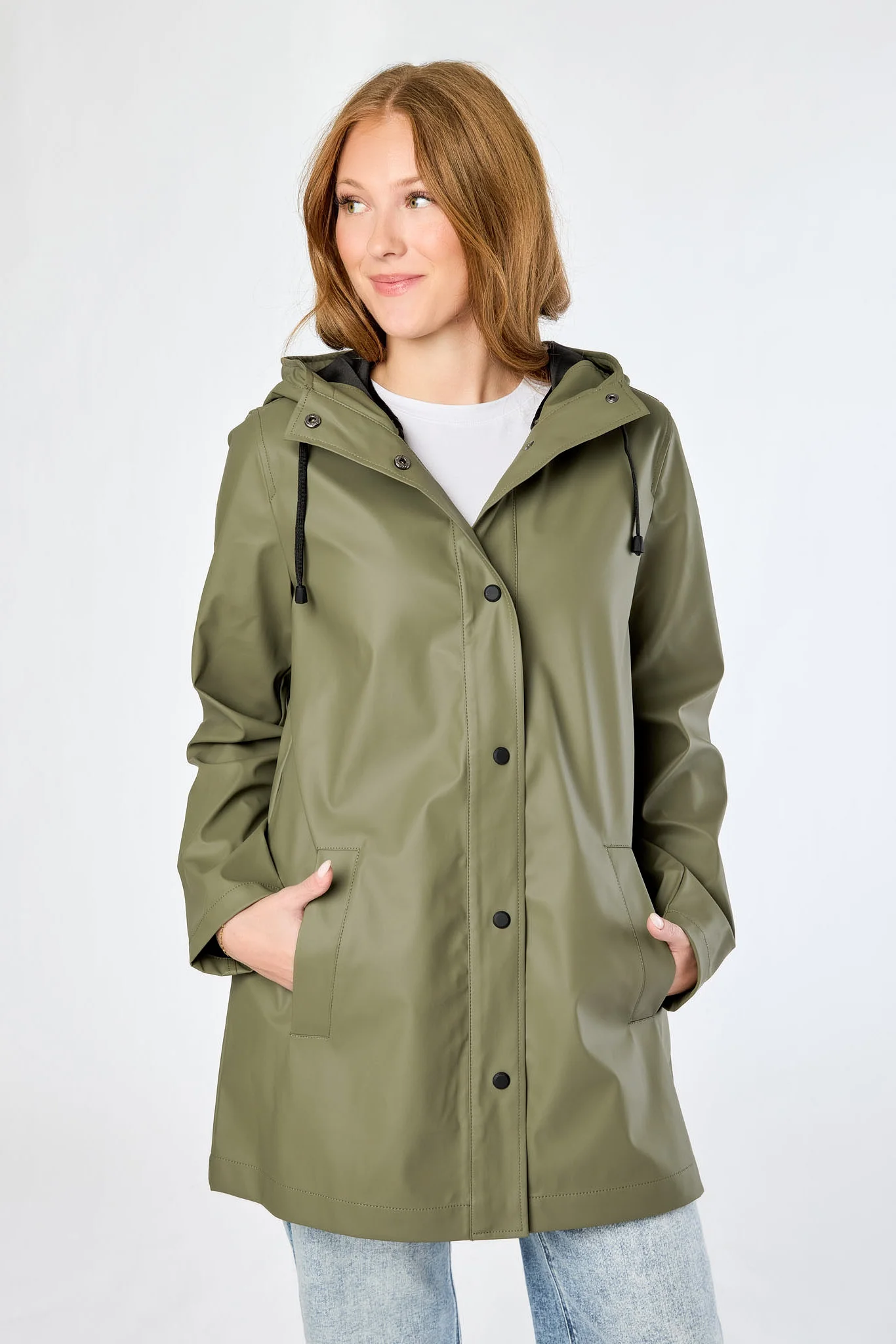 The ONLY Ellen Hooded Raincoat blends function with understated style. A sleek, waterproof raincoat in a matte finish with a snap-button front, adjustable drawstring hood, and hand-rest pockets. Designed in a clean, straight fit for easy everyday wear.